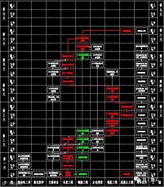 每个工作段为4小时,每天3个工作段。其中包括吊装工程、钢筋工程、水电预埋、模板工程等。