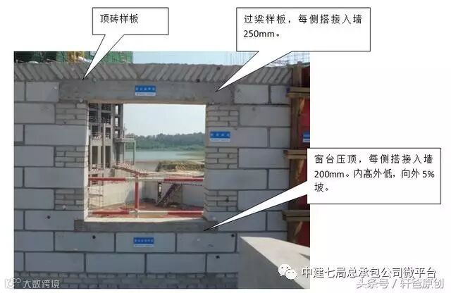 窗台压顶:窗台梁高100,宽同墙,配筋为2φ8+φ4@300,预制,伸入墙内200.内高外低,向外5%坡。