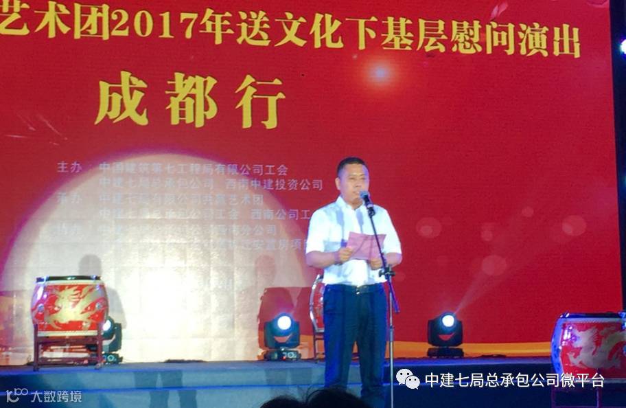 王宇光在演出致辞中讲到:送文化慰问演出走进成都,既是弘扬中建精神和七局共赢文化的重要举措,也是公司领导对奋战在一线的西南片区各项目员工和工友们的慰问与关怀,对于促进企业精神文明建设,巩固基层文化阵地具有重要意义。