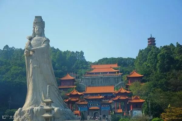 南沙天后宫,前身是明代南沙鹿颈村天妃庙,经重修定名为“元君古庙”。天后宫紧临珠江出海口伶仃洋,坐落于大角山东南麓,在天后广场正中就是石雕天后圣像(高达 14.5 米),是为纪念海上女神林默而建,其规模是现今世界同类建筑之最,被誉为“天下天后第一宫”,也是东南亚最大的妈祖庙。