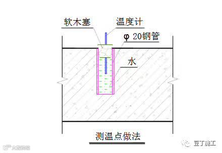 测温孔用DN20钢管制作,钢管一端焊死,支模板时用火烧丝固定于测温孔位置,为保证孔内温度与混凝土温度一致,孔内灌水(掺酒精以降低冰点),并用软木塞塞住孔口,软木塞中间钻一个洞,用于测温时放温度计,见《测温点做法》图。测温孔处注意用塑料薄膜和阻燃毛毡被盖好,防止热损失。