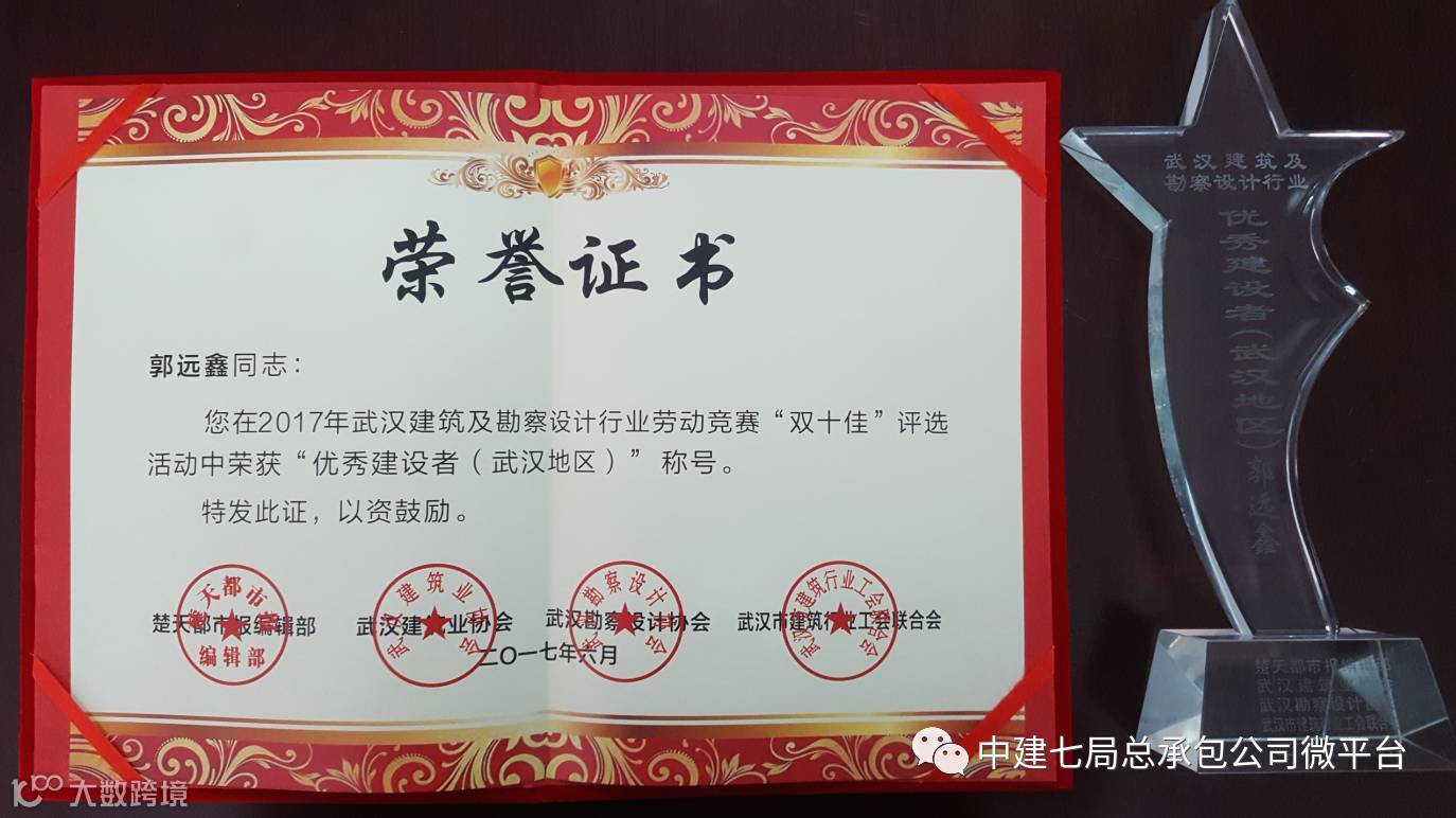 本次“双十佳”评选活动,由武汉市建筑行业工会联合会、武汉市建筑业协会、武汉市勘察设计协会及楚天都市报等单位联合举办。评选活动历时三个多月,150多个项目和个人报名参选,约79万人次网友参与投票。经过激烈地角逐,凭借着武汉市惠济路49号限价商品住房建设项目良好的社会赞誉度和认可度,郭远鑫成功获评武汉市2017年建筑及勘察设计行业“优秀建设者”。