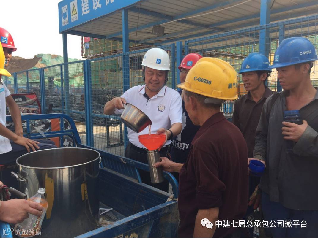 骄阳似火,热浪袭人,“三伏天”,范正华专门安排餐厅师傅每天都熬制绿豆水,并带领安全总监叶昌兵、生产经理吴成全到现场给劳务工人分发,还送去了藿香正气水、湿巾等防暑降温物品。广元天顺劳务公司的张东云高兴地说:“每天都有绿豆水喝,还可以免费领取这么多的防暑物品,在大企业工作就是好。”