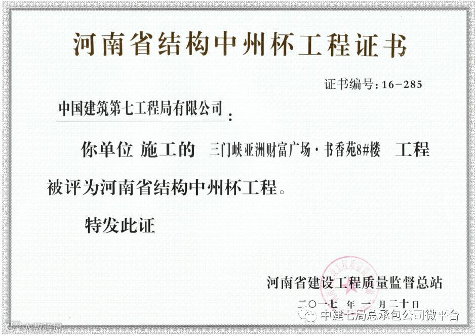 近日,从河南省建设工程监督总站获悉,三门峡市书香苑项目8#楼工程,经过层层筛选,被评选为 “河南省结构中州杯工程”。这是该项目继荣获“河南省住宅工程质量专项治理示范工程”、“三门峡市结构崤函杯”之后,再次荣获的省部级大奖。