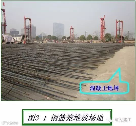 钢筋笼制作、存放场地应采用混凝土硬化(见图3-1),成品钢筋笼应堆放整齐,不得随意堆放,防止泥浆污染钢筋。