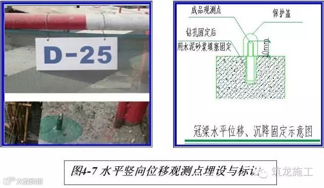 基坑顶部冠梁水平竖向位移观测点应采用钻孔埋设标准件。钻孔孔径应大于标准件直径5cm,周边采用M7.5的水泥砂浆填塞(见图4-7)。