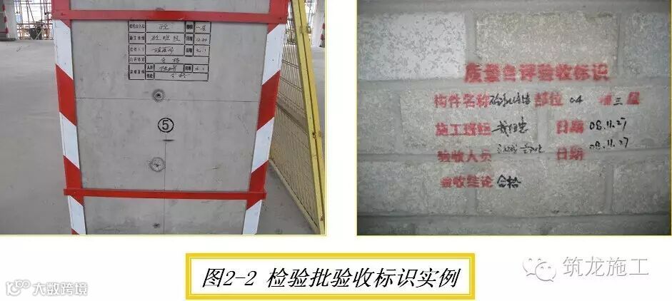 砌体、混凝土等实体工程应按检验批进行验收,并在相应构件明显部位设置验收标识(图2-2),标明施工人员、验收人员、验收日期及验收情况(参加人员、时间、结论)。