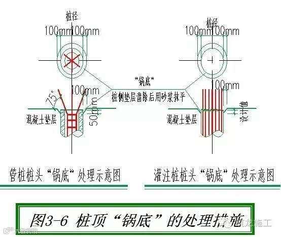 (2)当桩顶标高略低于设计标高时,应将桩侧做成 “锅底”状,侧边用水泥砂浆粉刷,确保有效桩头伸出锅底大于5cm,(见图3-5、3-6)。