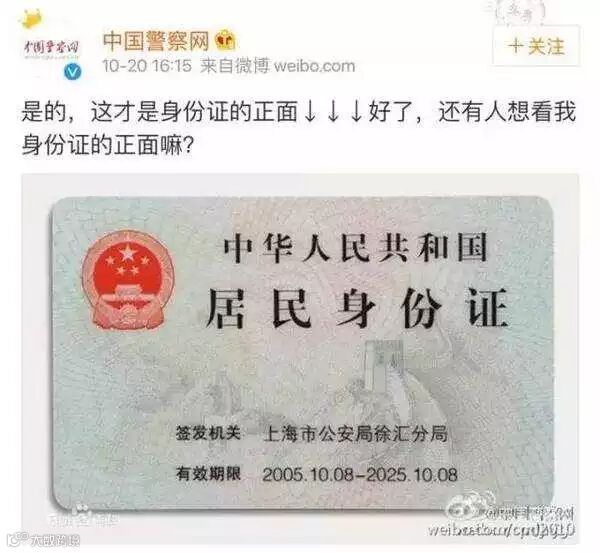 公安部主管的@中国警察网 通过微博确认:身份证的正面确实是印有“发证机关”和“有效期”的一面。