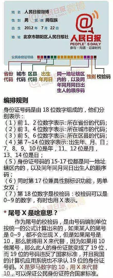 身份证号码是我国为每个公民从出生之日起编定的唯一的、终身不变的身份代码,也是证明持有人身份的唯一证件。但身份证上的号码代表什么意思,你知道吗?