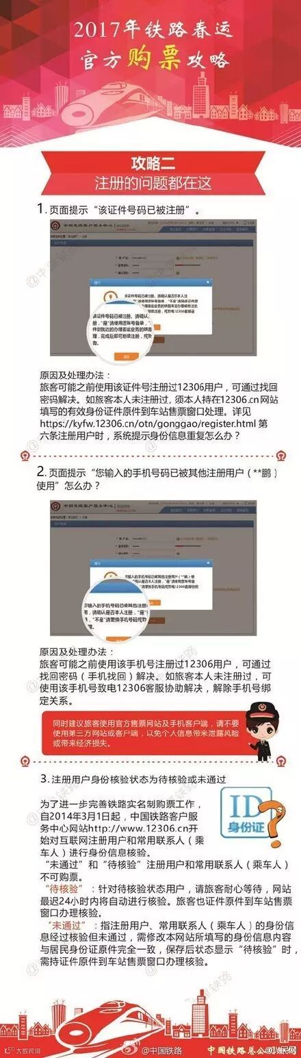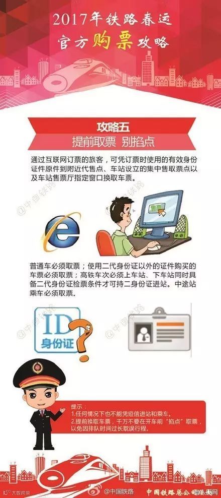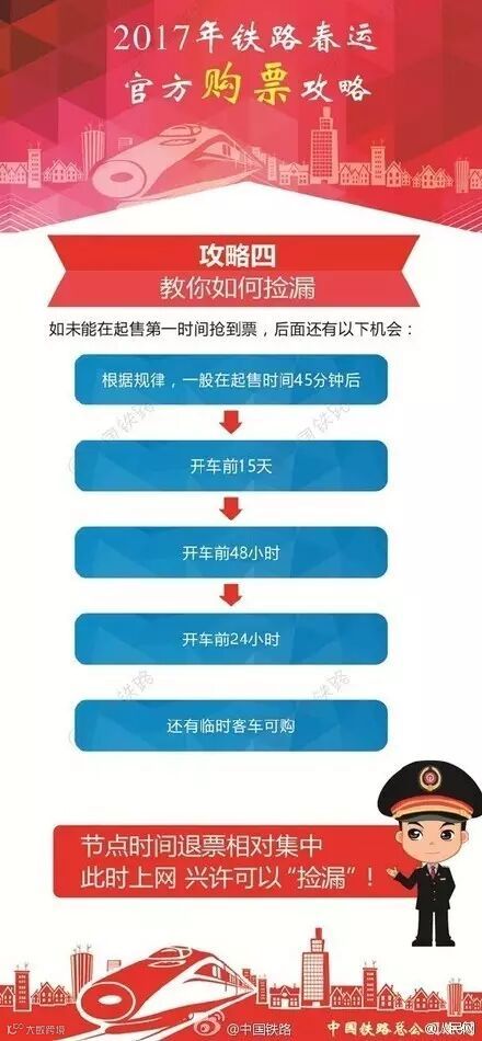 购票攻略来啦!明天是12月15日,通过网络和电话可以购买2017年1月13日,也就是2017年春运第一天的火车票了。要买票的童鞋不要急不要慌也不要紧张,中国铁路为大家准备了2017年铁路春运官方购票攻略,注册、购票、捡漏、取票,你想知道的东西都在这。快戳大图收藏吧!
