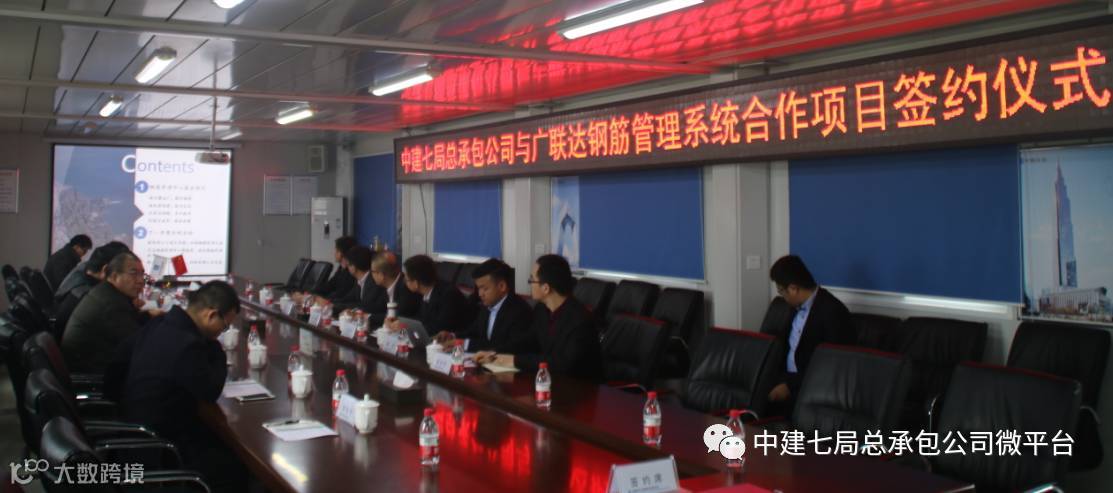 12月20日,中建七局总承包公司与广联达科技股份有限公司钢筋管理系统合作项目签约仪式在白沙安置区二期(永盛家园)项目举行,双方共同签署了《钢筋管理系统项目合作协议书》,标志着我公司将全程参与广联达公司钢筋管理系统地研发,共享著作权。局商务管理部副总经理路军平,公司总经理苏方毅、总经济师付新建,商务管理部经理万志欣,广联达科技股份有限公司副总裁郭冬建等参加仪式。
