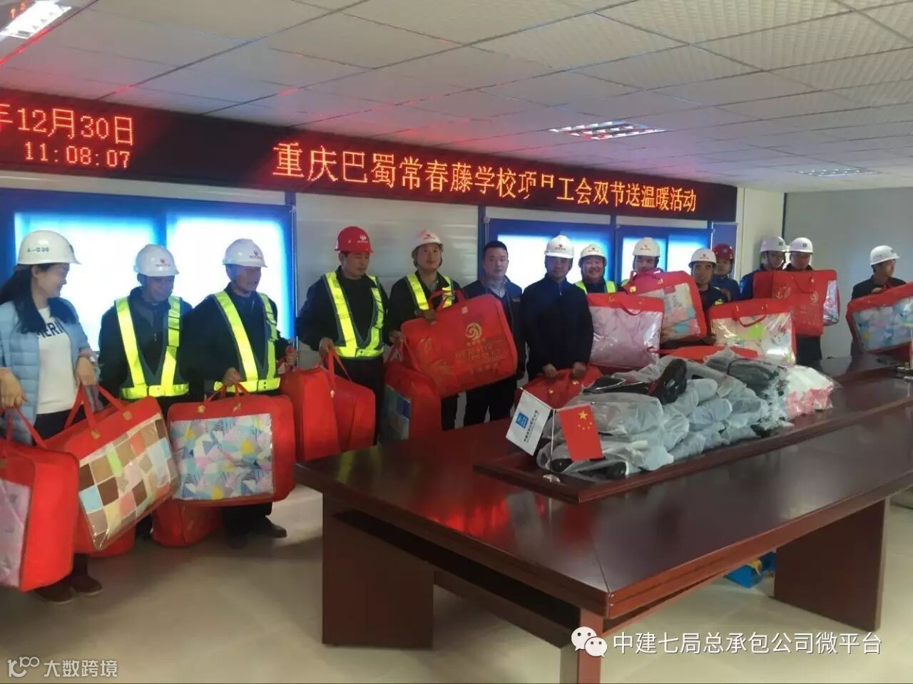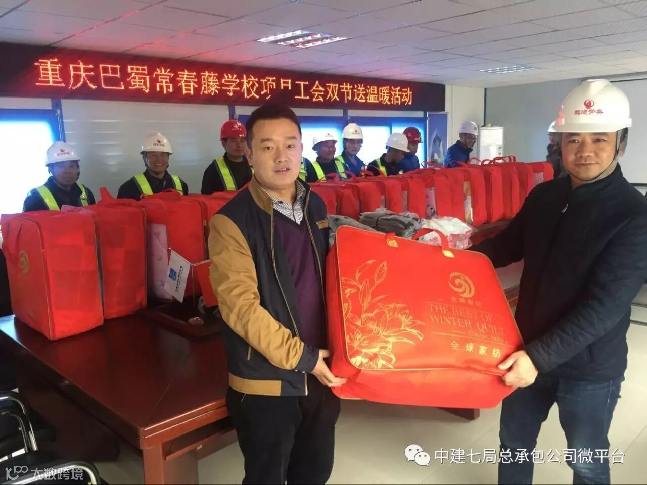 近日,重庆巴蜀常春藤学校项目部开展了双节送温暖活动,为奋战在施工一线的劳务工人发放了被子、雨衣、雨鞋、手套等慰问品。