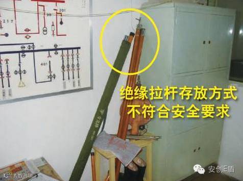 排查依据:DB 11527-2008《变配电室安全管理规范》5.18.5 绝缘拉杆应悬挂或架在支架上,不应与墙接触。