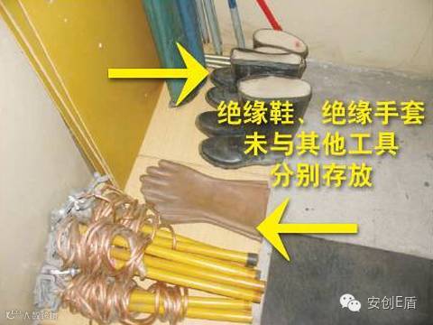 排查依据:DB 11527-2008《变配电室安全管理规范》5.18.5 绝缘靴、绝缘手套应存放在密闭的橱内,并与其他工具一表分开存放。