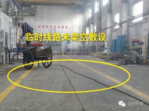 排查依据:《电气安全管理规程》(机械工业部[86]机生字 76号)第20条 临时线路必须采用绝缘良好的导线,应用电杆沿墙用合格瓷瓶固定架设,导线距地面的高度室内应不低于2.5m。
