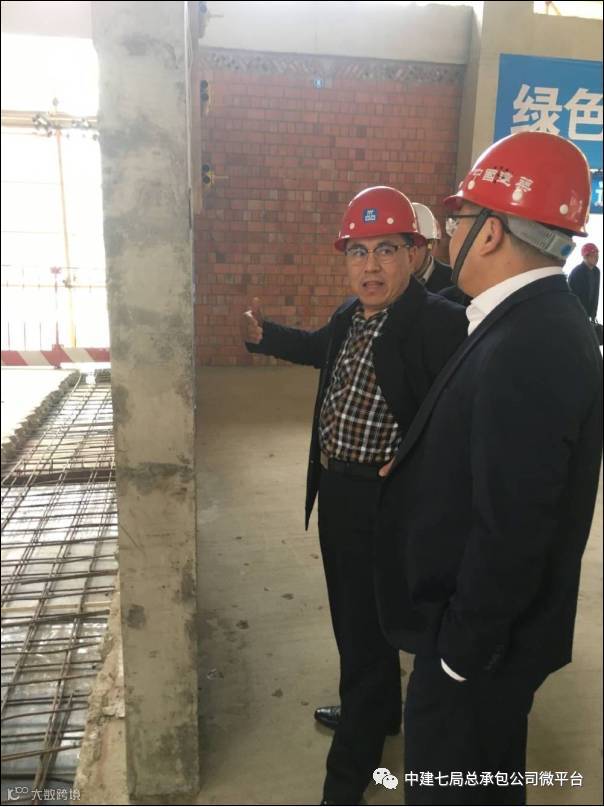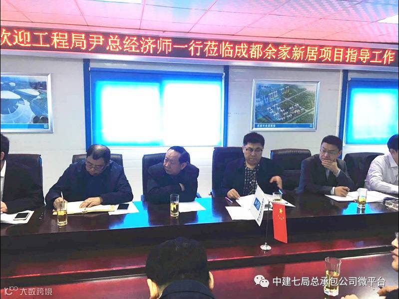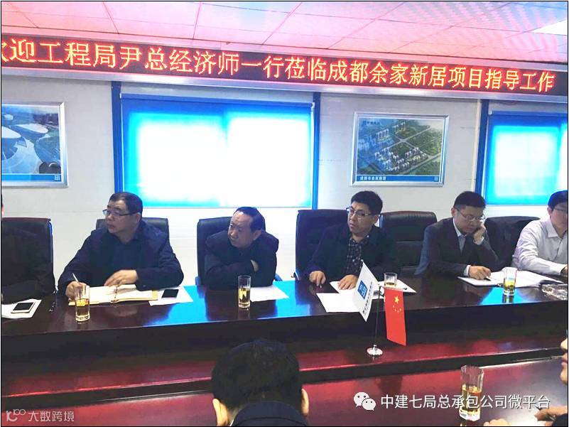 近日,中建七局副总经理、总经济师尹大勇一行莅临总承包公司成都市金牛区余家新居项目部调研商务管理情况。局商务管理部总经理杨华斌、副总经理顾小峰、执行经理吕士芳,局西南投资公司运营总监樊勋、投资总监沙庆杰,总承包公司总经济师付新建,西南分公司经理刘宏军、书记刘仕利、总经济师卓俊等陪同。