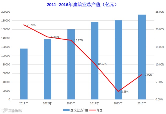 初步核算,建筑业总产值193567亿元,同比增速7.1%。历经2015年的“探底”,建筑业增速开始回升。