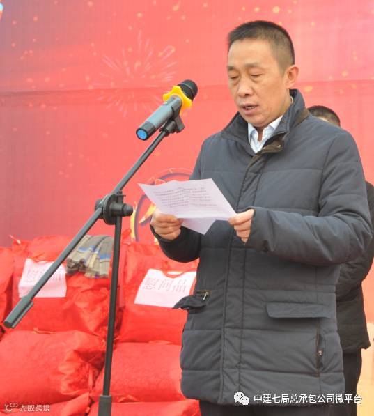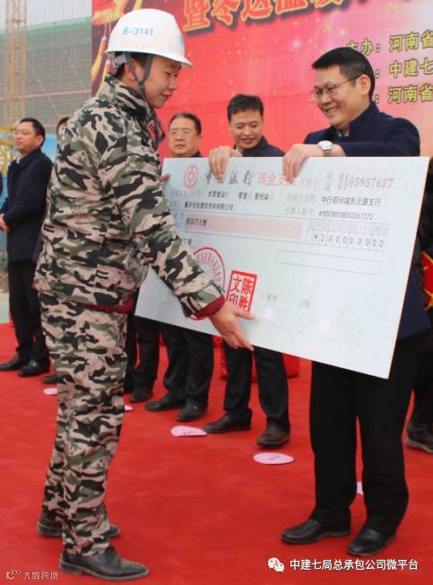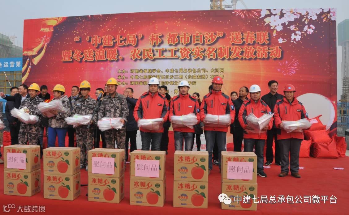 1月18日上午,位于郑州市白沙镇的一处建筑工地旁,一派欢声笑语,喜庆热闹,原来,这里正在举办“‘中建七局杯、都市白沙送春联’暨冬送温暖、农民工工资实名制发放活动”,参加活动的农民工代表们轻快地走上台来,接过由中建七局总承包公司总经理苏方毅、工会主席王修钰等领导送上的由春联、“送温暖”慰问品和大额现金支票等组成的沉甸甸的“套餐大礼包”后,各个喜笑颜开,连声对公司的一片盛情爱义表示感谢。