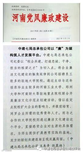 近日,中建七局总承包公司的“校企共建,打造忠诚、干净、担当的栋梁之才”活动荣登《河南党风廉政建设》期刊,该期刊的“经验视窗”板块对公司以“廉”为媒,构筑人才发展平台的先进经验进行了宣传报道。