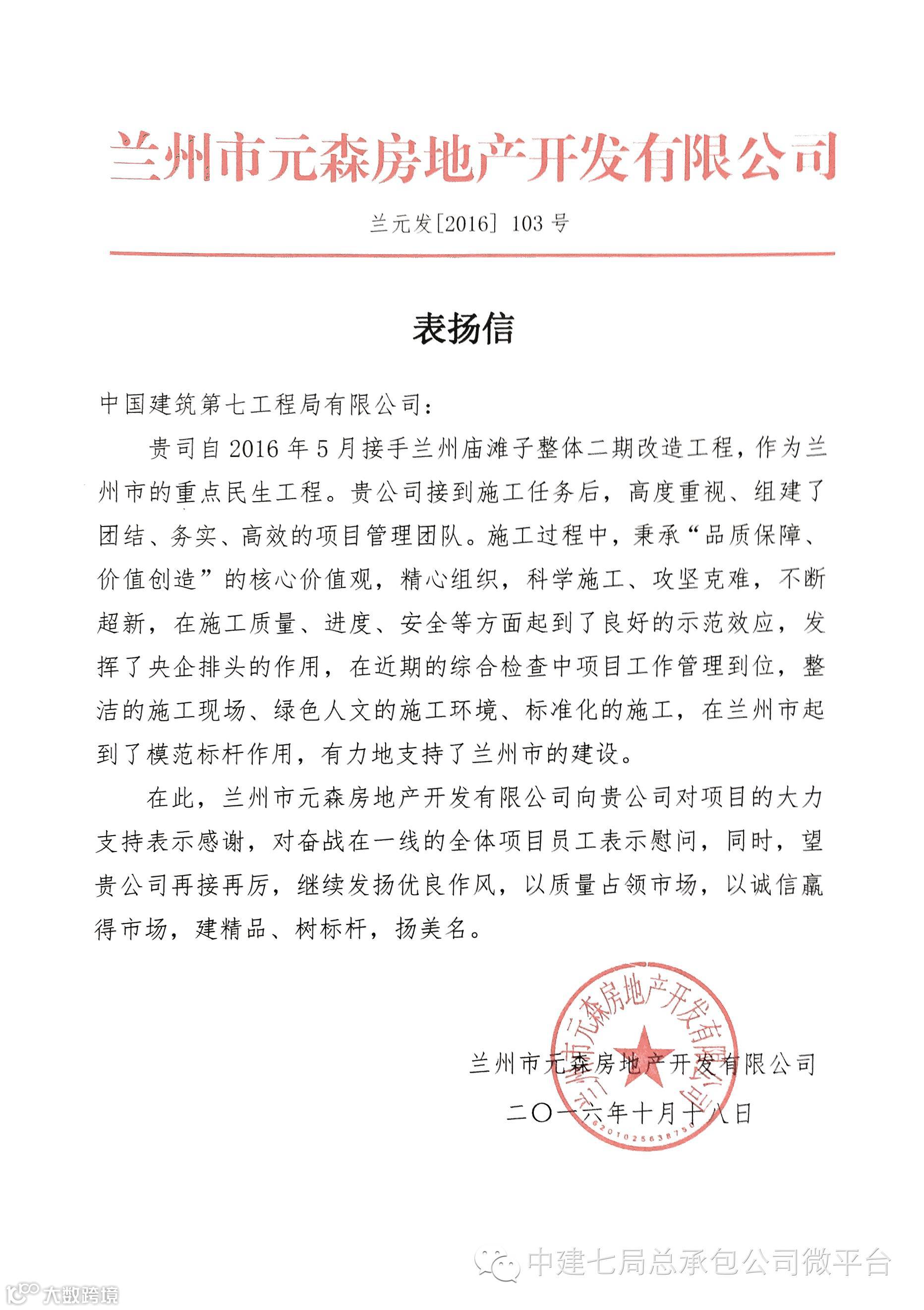 导读:10月18日,由我公司施工的兰州庙滩子整体二期改造工程收到了一封来自业主方的表扬信,信中,业主方对我公司兰州
