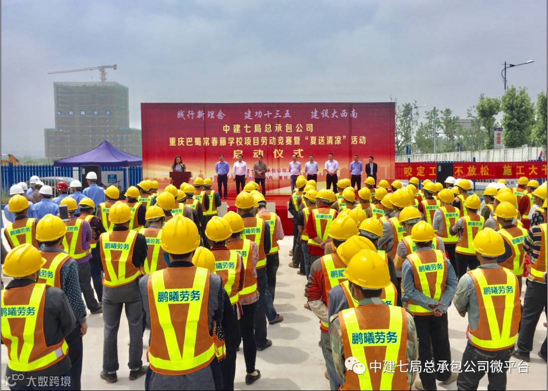近日,重庆巴蜀常春藤学校项目“大干50天”劳动竞赛暨公司“夏送清凉”活动启动仪式隆重举行,公司工会工作部部长李嘉佳,资金部经理王文锋,工程部副经理程威风,西南分公司经理刘宏军,西南分公司副经理、重庆巴蜀常春藤学校项目经理康彦君,建设单位、监理公司代表,项目全体员工及各施工班组近200人参加了仪式。