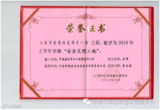 近日,总承包公司三门峡八方书香苑项目荣获了由三门峡市住房和城乡建设局授予的“2016年上半年市级安全文明工地”称号。