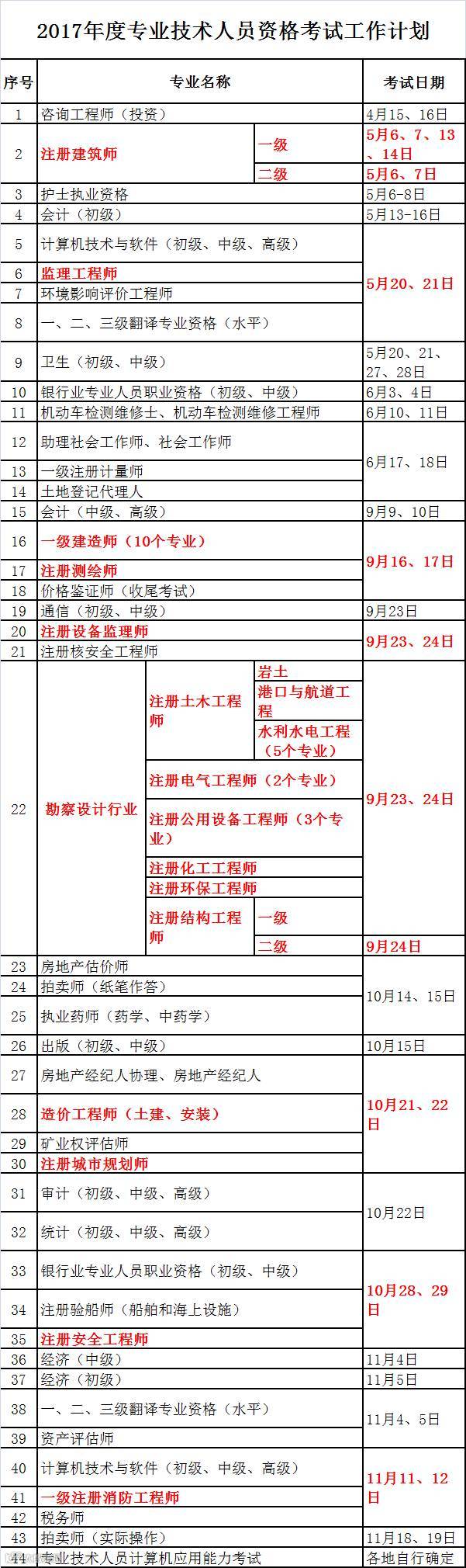 近日,国家2017年度专业技术人员资格考试计划正式发布,对考试专业名称及考试日期进行了详细公示,包括一级建造师、注册建筑师、注册土木工程师、注册结构工程师、监理工程师、造价工程师、注册安全工程师等,快来看看!
