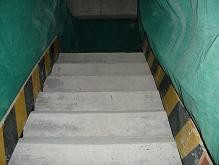 A34、施工楼梯搭设原材料要求:采用钢管、钢网踏步板或钢板踏步板、5mm厚胶合板踢脚板;施工楼梯搭设要求:踏步板宽300mm,楼梯宽度≥1000mm,休息平台宽度≥1000mm,踢脚板高180mm,坡度宜采用1∶3,栏杆高度1.2m。