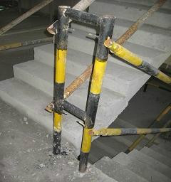 A23、楼梯护栏设置要求:采用可拆卸水管护栏,高度≥1.2m;临边超过3m落差的楼梯必须挂网及底部安装180mm高踢脚板,踢脚板采用≥9mm厚胶合板制作。