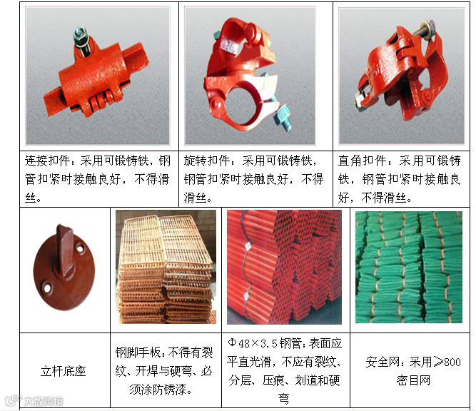 A1、材料应按国家现行标准进行100%外观检查,所有脚手架材料经检验合格后进行合格品标识妥善保管,必须具备产品质量合格证、生产许可证、专业检测单位检测报告。