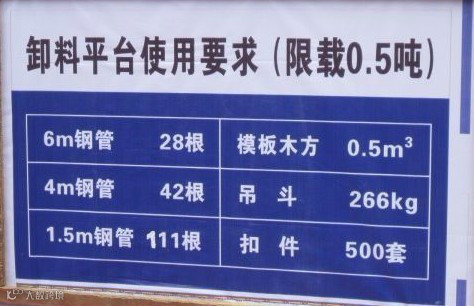 整体预制式卸料平台标识要求:每次安装完毕后必须经监理公司验收合格后方可投入使用,并做好每次验收的书面记录,限重标志采用“傻瓜式”限重标识牌。堆放高度不能超过卸料护栏高度;如堆放钢管时,伸出卸料平台外尺寸不得超过钢管总长度的1/4;