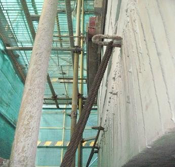 钢丝绳卸载预埋件错误做法:预埋件安装在结构梁面上,给外墙施工留下渗漏隐患。