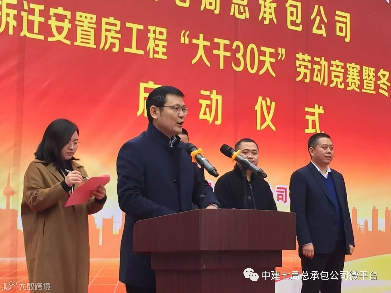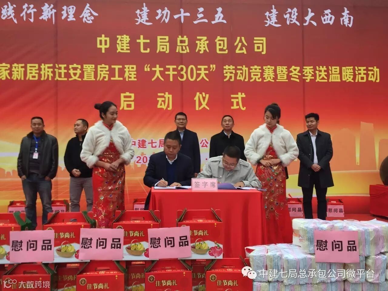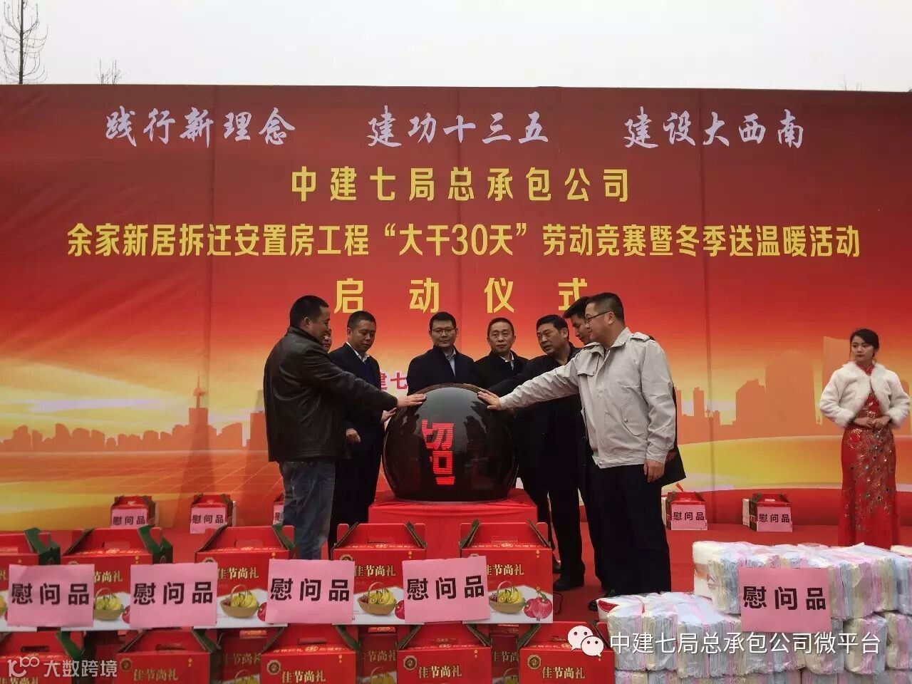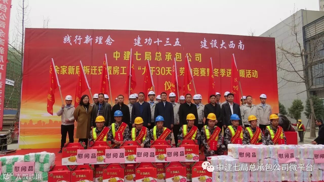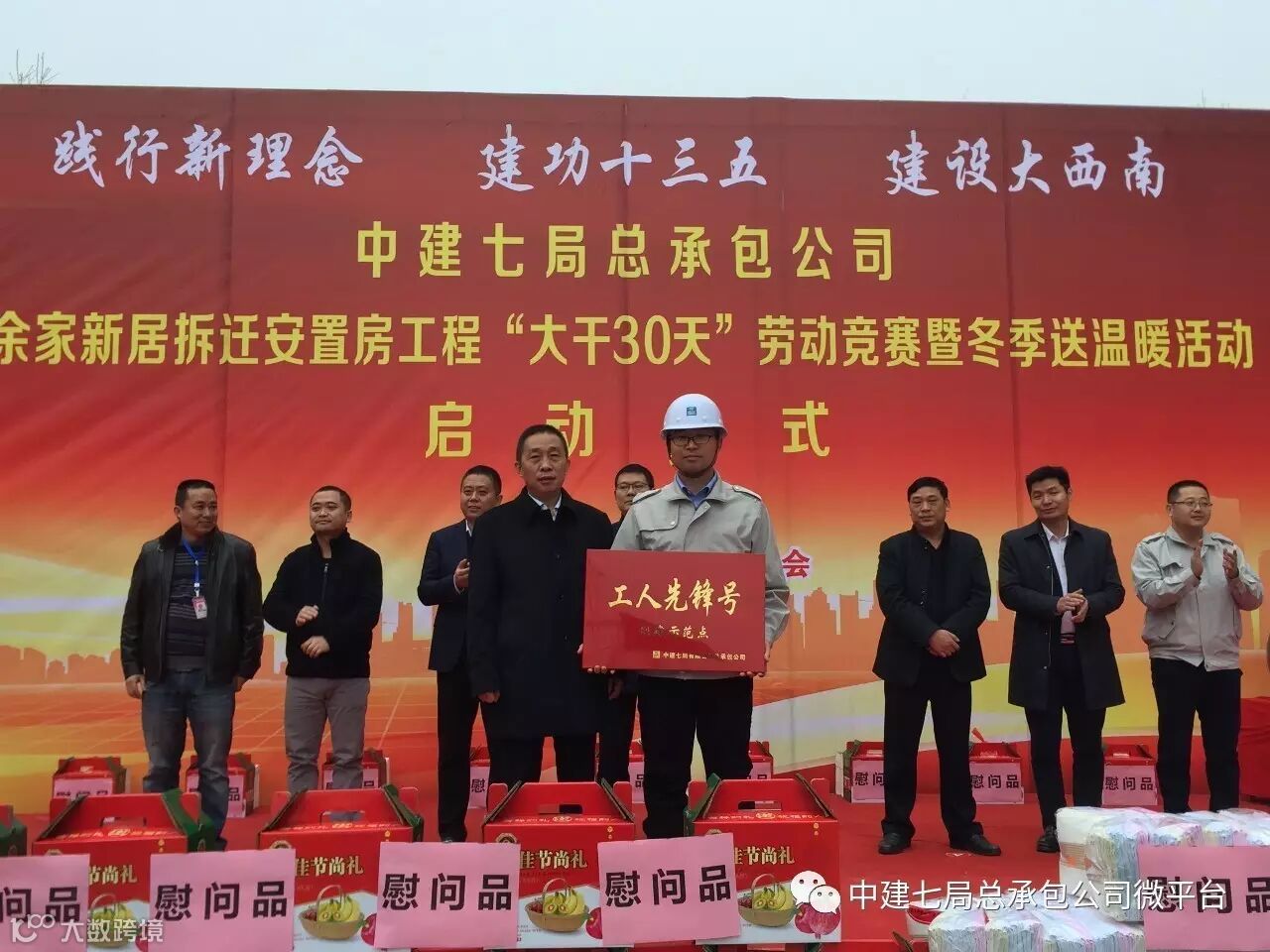 近日,余家新居项目隆重召开“大干30天”劳动竞赛启动大会暨冬送温暖活动。公司总经理苏方毅,工会主席、总会计师王修钰,副总经理王宇光,助理总经理蒋志新,西南分公司负责人刘仕利,余家新居项目经理刘宏军,以及建设单位、监理单位和项目管理人员、劳务班组代表等200余人参加,活动由工会部部长李嘉佳主持。