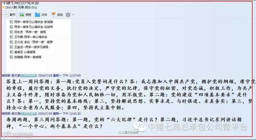 为了保证基层项目施工、学习两不误,同时,切实地让“两学一做”学习教育的精神内涵入脑入心,近日,总承包公司白沙项目党支部通过建立支部微信群、支部QQ群和用好党群活动日三种途径把这项工作落到了实处。