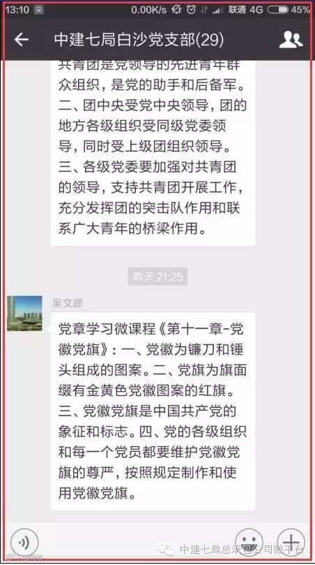 每天,项目书记吴文彦带头在微信群里发表自己的“两学一做”学习体会,其他党员同志在其影响下,也会积极发言,最终形成“比学赶超”的良好学习氛围。