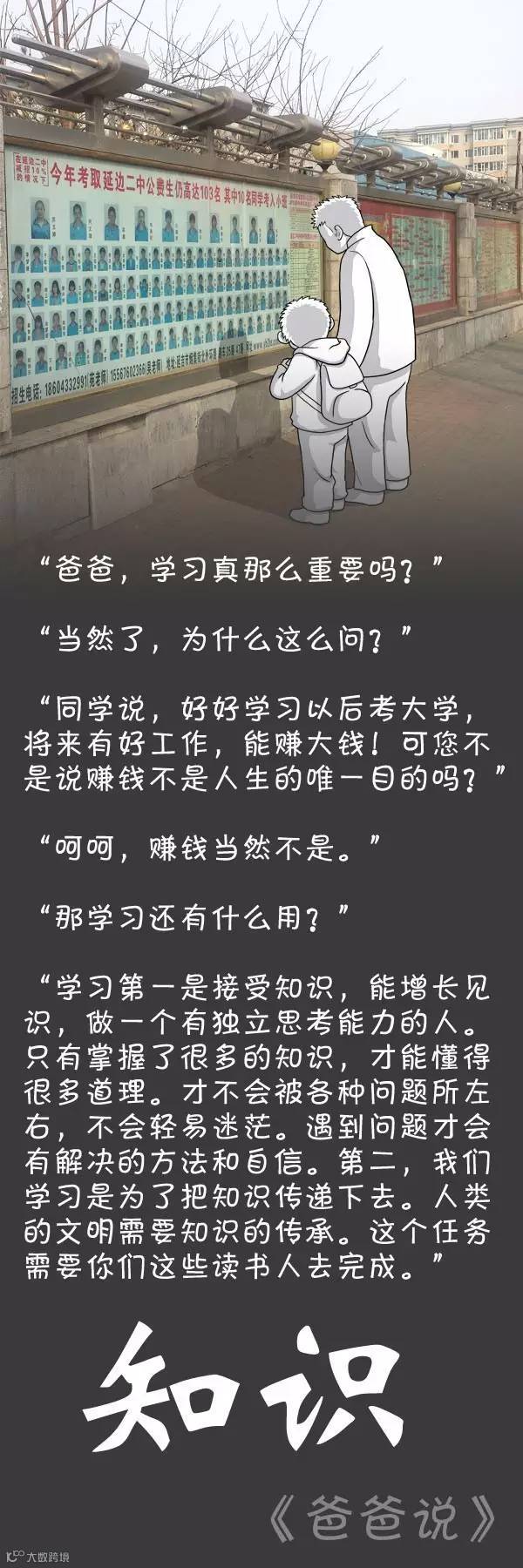 近日,一组父子对话的漫画火爆网络。“越有钱就越了不起?为什么很多人闯红灯?学习真那么重要吗?”,爸爸的回答令人深思: