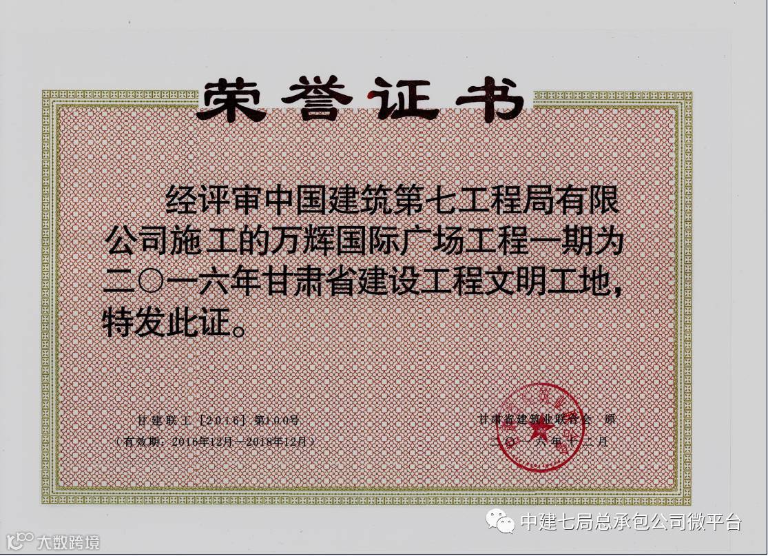 近日,从甘肃省建筑业联合会获悉,由我司承建的万辉国际广场项目被评为“甘肃省建设工程文明工地”,该奖项为甘肃省建设工程安全文明施工标准化最高奖项。