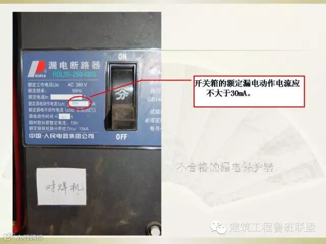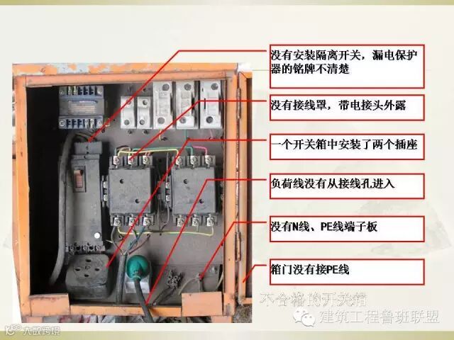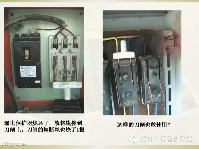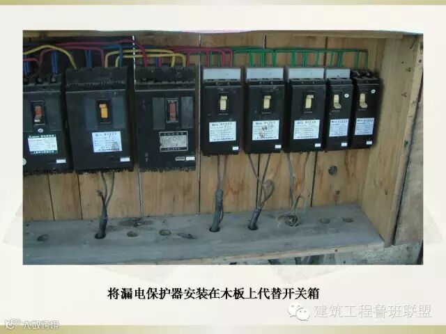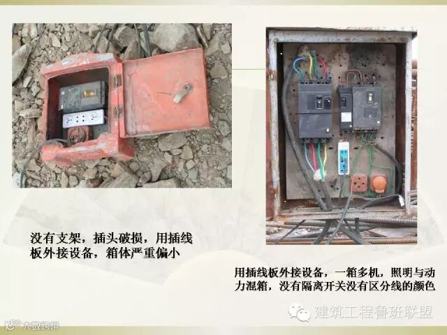 4.3开关箱常见问题:箱体偏小,电器间距不符合要求,箱门与箱体间不连接PE线或用铜芯线代替编织软铜线,电器安装顺序不符合要求(隔离开关、断路器、漏电保护器),超过3Kw以上电器设备的开关箱中没有安装断路器,漏电保护器的参数不符合要求,移动式开关箱没有支架,离地高度不符合要求,一箱多机等。分包单位的开关箱大部分不符合要求。