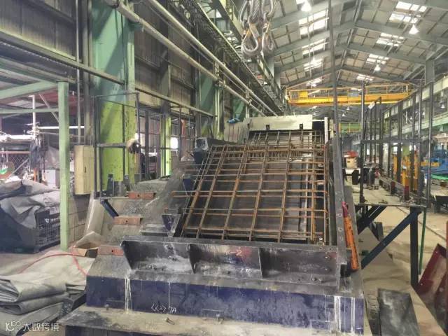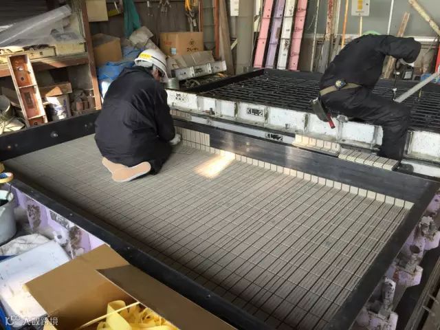 这是在工厂里贴墙砖,工人们把墙砖预先放在模具里,再放上钢筋,倒入混凝土。