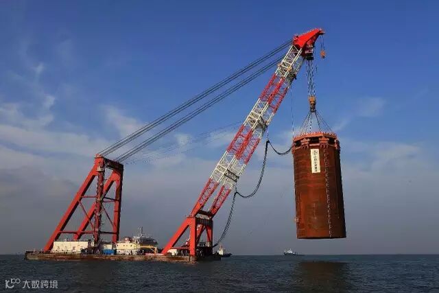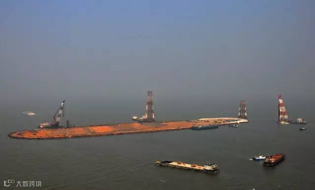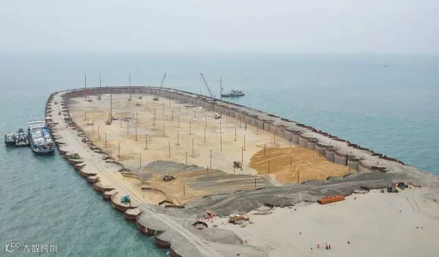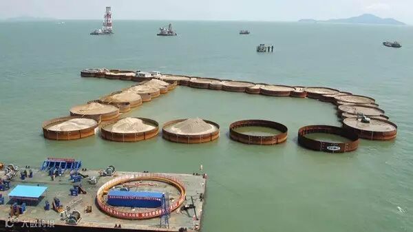 ▼巨型钢筒串成人工岛的框架