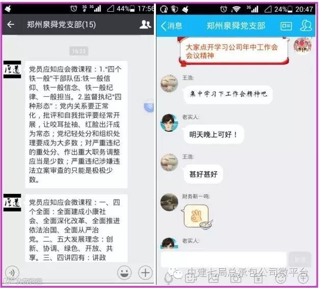 为了在繁忙的施工中,持续深入地开展“两学一做”学习教育,提升全体党员的政治素质和担当意识,8月初,总承包公司郑州泉舜项目党支部QQ群、微信群全面开通,不定时全方位地宣传党的系统知识、工程局和公司的2016年年中工作会精神,交流学习体会等,获得了项目员工尤其是党员的欢迎。同时,该QQ群、微信群还与总承包公司的党群活动日相关活动相结合,保障了党建工作更加常态化、系统化。