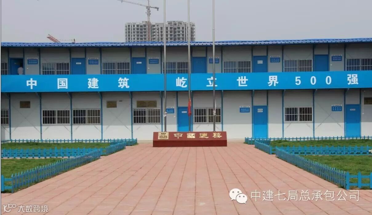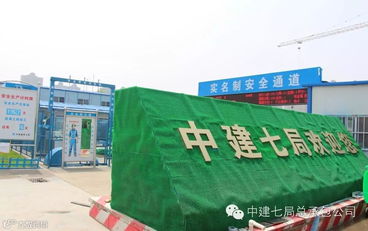 办公区域内预留四块空地,现已全部铺设草坪,小草在中建旗帜的光辉下绿油发亮。施工现场门口“中建七局欢迎您”几个醒目的大字空隙间也被披上了一抹绿色。