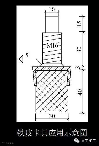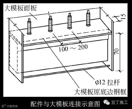 卡具上表面连接如下图所示的螺栓,螺栓间距与钢框板上的Φ16孔孔距一致。将下图所示的配件穿过钢框板上的圆孔,与大模板根部相连接(见下图)。