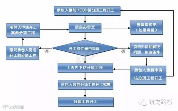 如何高效组织项目的各项管理工作,优质高效完成建设任务,是作为项目管理人员时时刻刻都在关注的问题。而在项目部的实际管理工作中,经常出现各种协调未果、措施不落实、计划成空谈、管理工作效率低下等现象。下面这些框图,涵盖了从项目开工到竣工丰富的工作内容,无论是以此来规范自身管理工作,或是作为施组方案编制的图表素材,都是大有用处的。