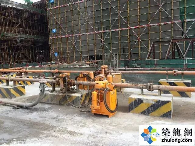泵车选择料斗容量小但输送压力大的型号;泵管选择专用高压泵管,为了节约成本,低层施工时可不投入高压泵管,只采用普通泵管,待输送高度达到一定高度时,再用高压泵管替换;截止阀布置在正负零位置,防回流冲击弯头每30层布置一次。