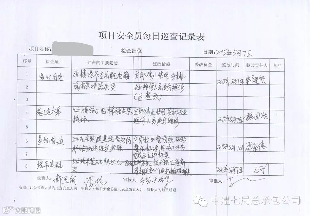 这项制度在执行时严格到如下程度:一是要求项目安全员必须到施工现场做安全巡查,填写《项目安全员每日巡查记录表》,并由项目部安全生产监督管理部每日下午5时许准时上报公司安监部。二是要求项目经理必须履行项目安全生产第一责任人的职责,每日对本项目上报的《项目安全员每日巡查记录表》予以签字确认;三是要求上报的《项目安全员每日巡查记录表》内容必须真实有效,能反映当日现场安全生产情况,严禁项目部瞒报、谎报事故及安全隐患,且上报内容必须按照公司规定,对主要巡检项做详细填写。为防止个别安全员投机取巧,敷衍了事,公司安监部特别规定,每日巡查记录表必须为手写件。