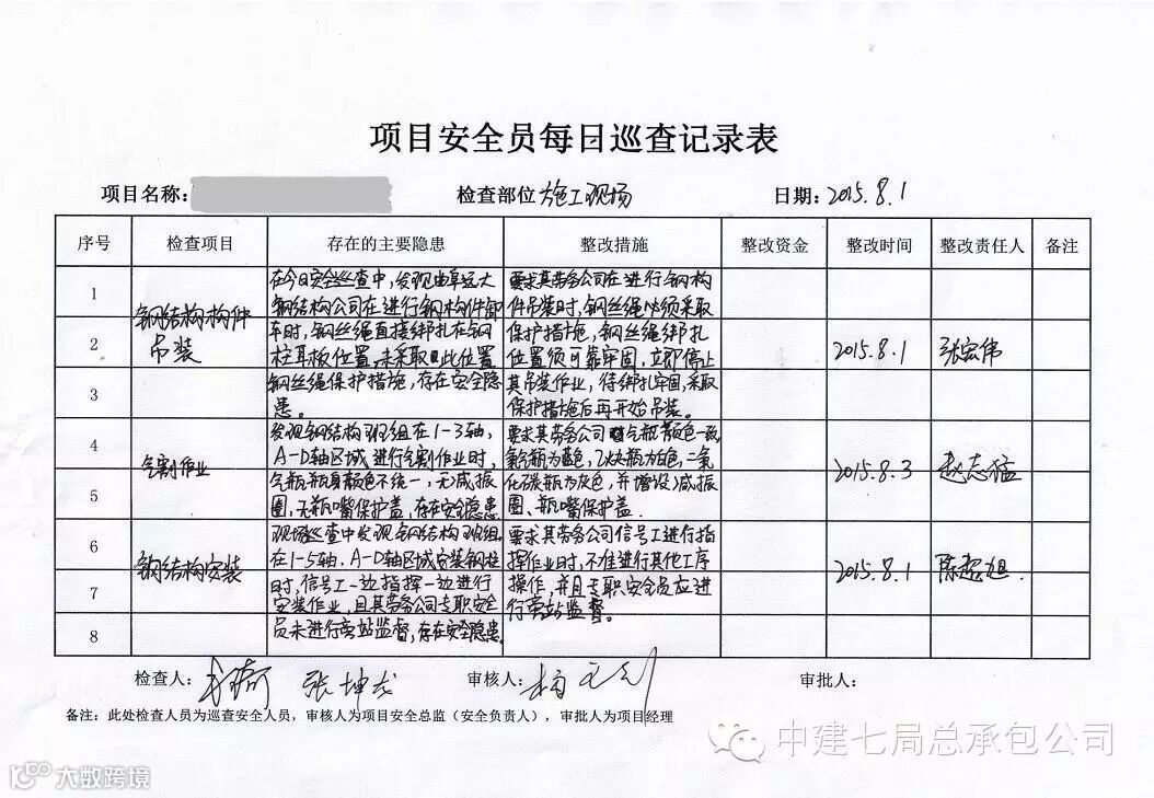 “我们公司是在2015年初印发的《中建七局总承包公司项目安全员每日巡检上报制度》,主要目的就是全面、彻底、持续地排查、整改、消除安全事故隐患,让施工生产安全处于可控状态。”陈建飞介绍,“这项制度与我们先期制定的生产安全事故隐患排查治理制度相配合,通过去年的严格实施,全公司41个在施项目全年共上报安全隐患29765条、重大安全隐患293条,这些安全隐患全部得到了及时跟踪和整改。可以说,我们2015年安全事故为历年来最低,和不打折扣地执行这个制度大有关系。”