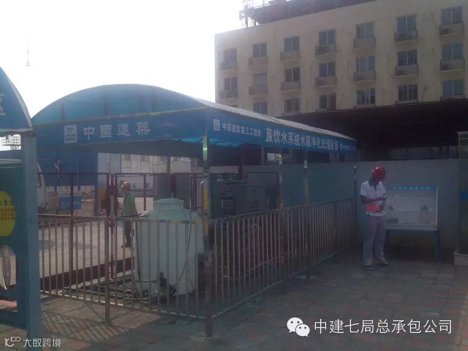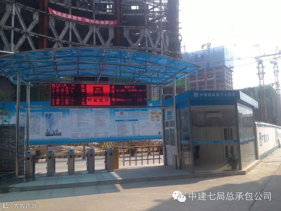 项目在开工之初对现场进行了策划,合理布置文化墙及各类图牌、标识标语等,三区分离,在靠近生活区和项目部的施工现场2个入口处均设有门禁,门禁入口处上设有LED大屏幕,屏幕与门禁系统相通,在LED屏幕上直接显示现场总人数和总包人数、各个专业分包的人数及管理人员人数,当天的天气和企业精神、人员信息在LED屏幕上一目了然。 项目部设有直饮水系统,并且施工现场入口处设有直饮水管,有效缓解了施工现场的饮用水问题。