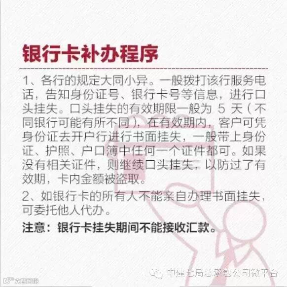 中建七局总承包公司身份证、户口簿、社保卡、医保卡、银行卡、驾照……生活中,这些证件对我们至关重要,一旦丢失,免不了一阵手忙脚乱。如果不小心遗失了这些证件应该怎么挂失、如何补办?补办时需要携带什么材料?一般补办期限多久?小编和大家分享8种重要证件丢失补办方法,不看后悔哟!